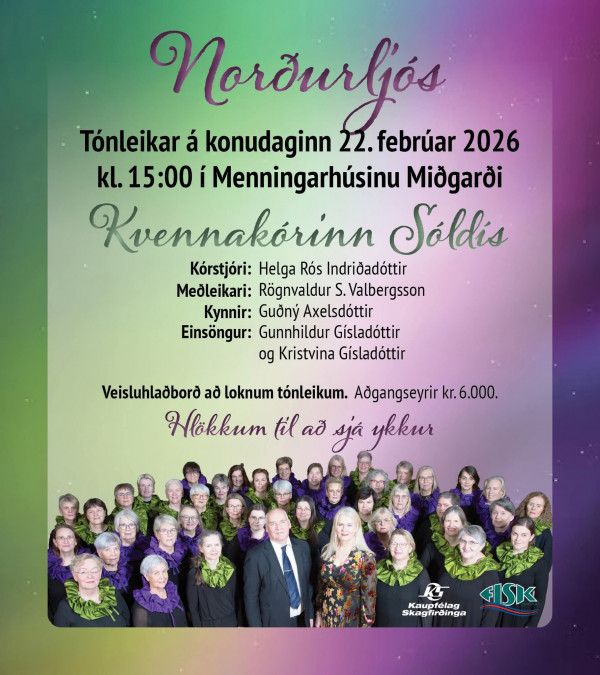 Kvennakórinn Sóldís heldur sína árlegu tónleika í Miðgarði á sjálfan konudaginn, sem er næstkomandi sunnudag 22. febrúar og hefjast tónleikarnir klukkan 15:00. Miðaverð 6000,- Kaffiveitingar að tónleikum loknum.